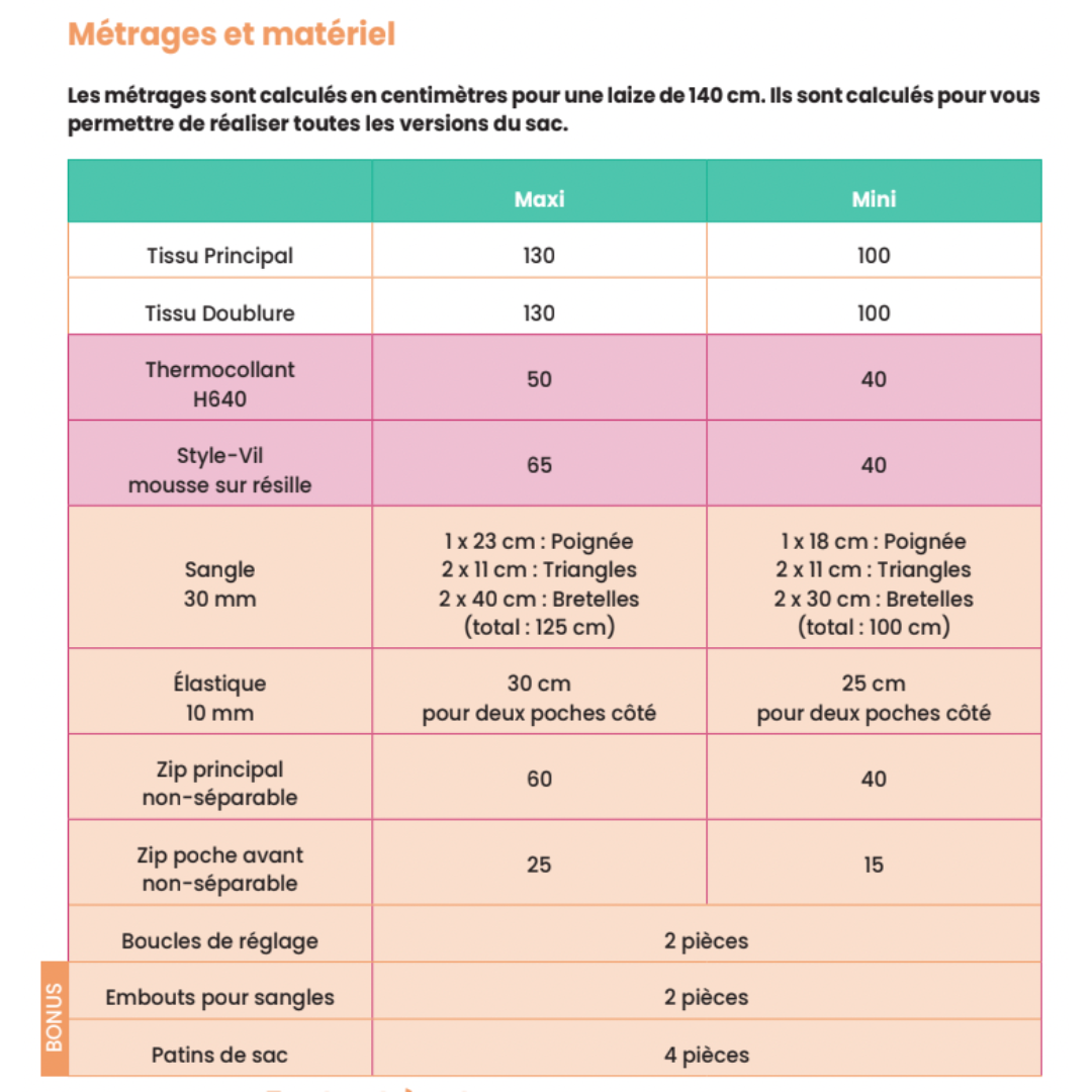 - Le métrage en tissu principal et tissu doublure (1 canevas motifs + un tissu uni tel que canevas waterproof, velours côtelé lavé, jeans, milleraies, simili cuir,..) À combiner et assembler selon vos envies.