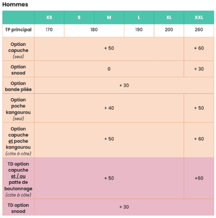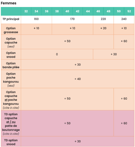👉 4 gammes de tailles : 0-4 ans, 5-12 ans, femme 32-52 (dont une option grossesse), homme XS-XXL