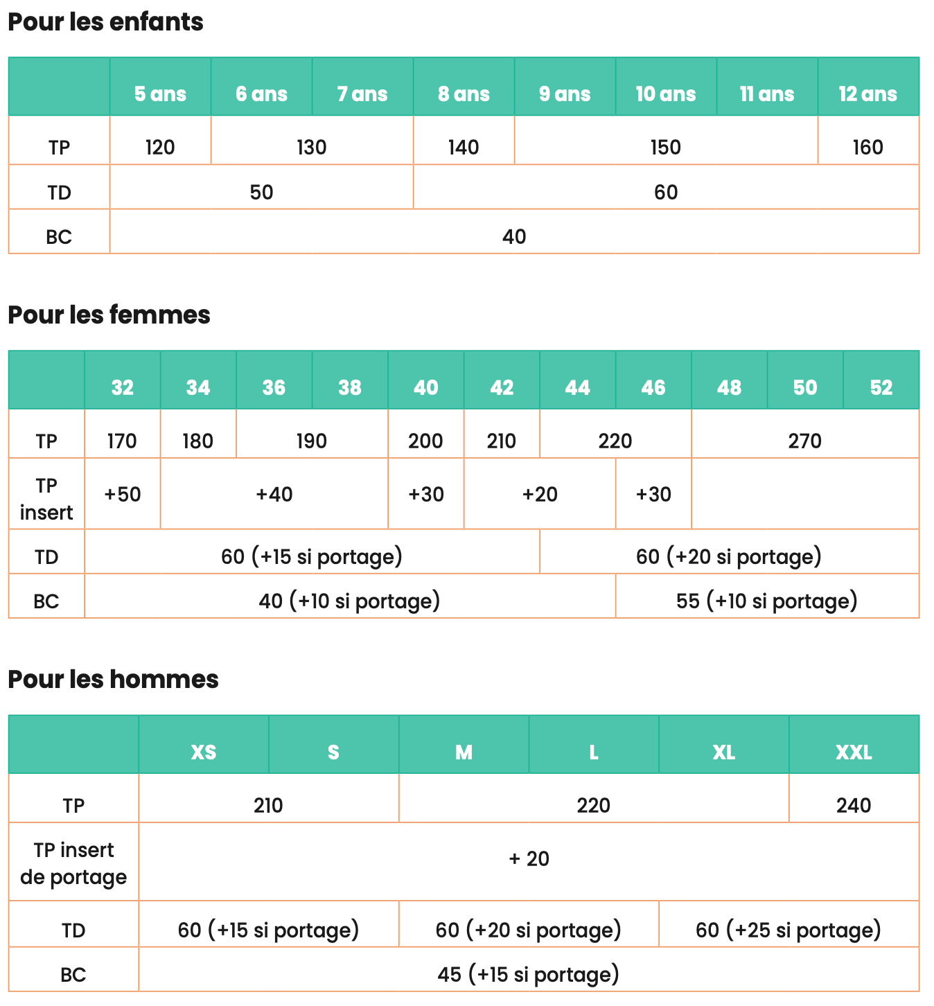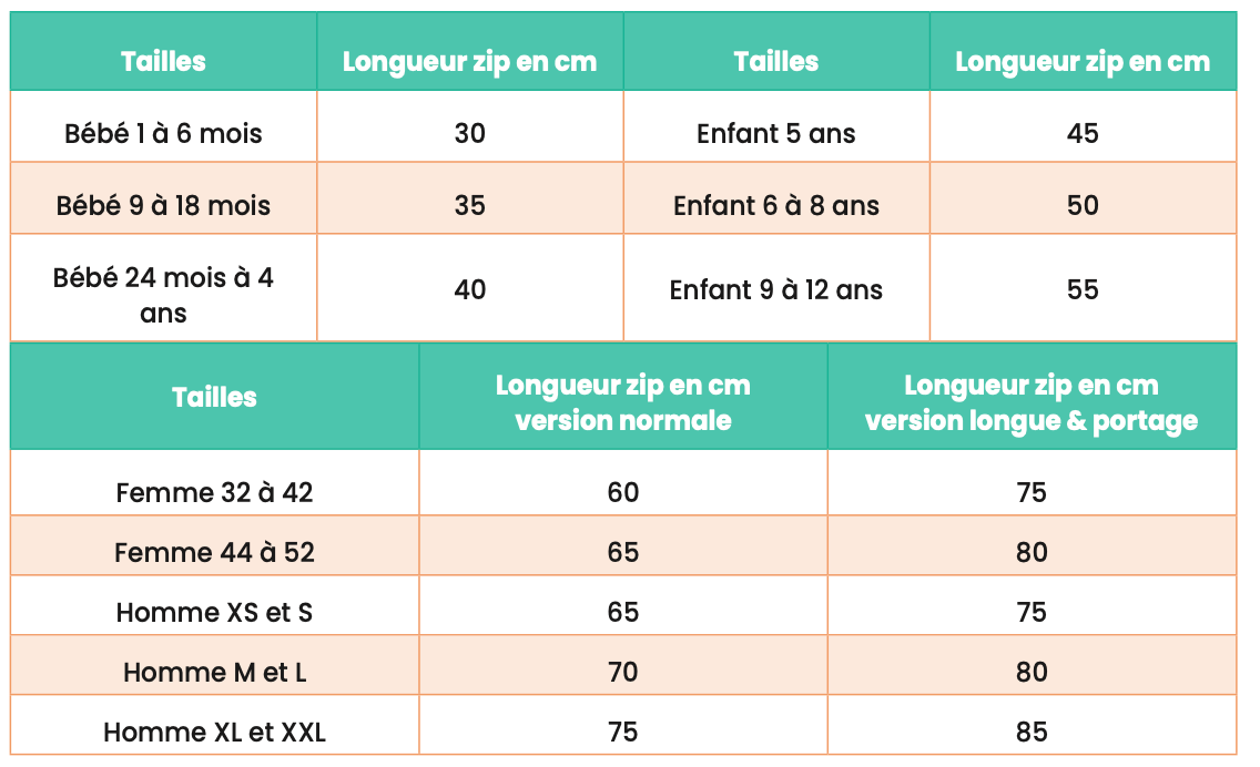 Le patron est disponible pour bébé (1 mois - 4 ans), enfant (5 - 12 ans), femme (32 - 52), homme (XS - XXL).
