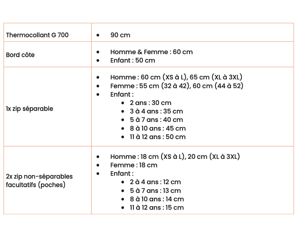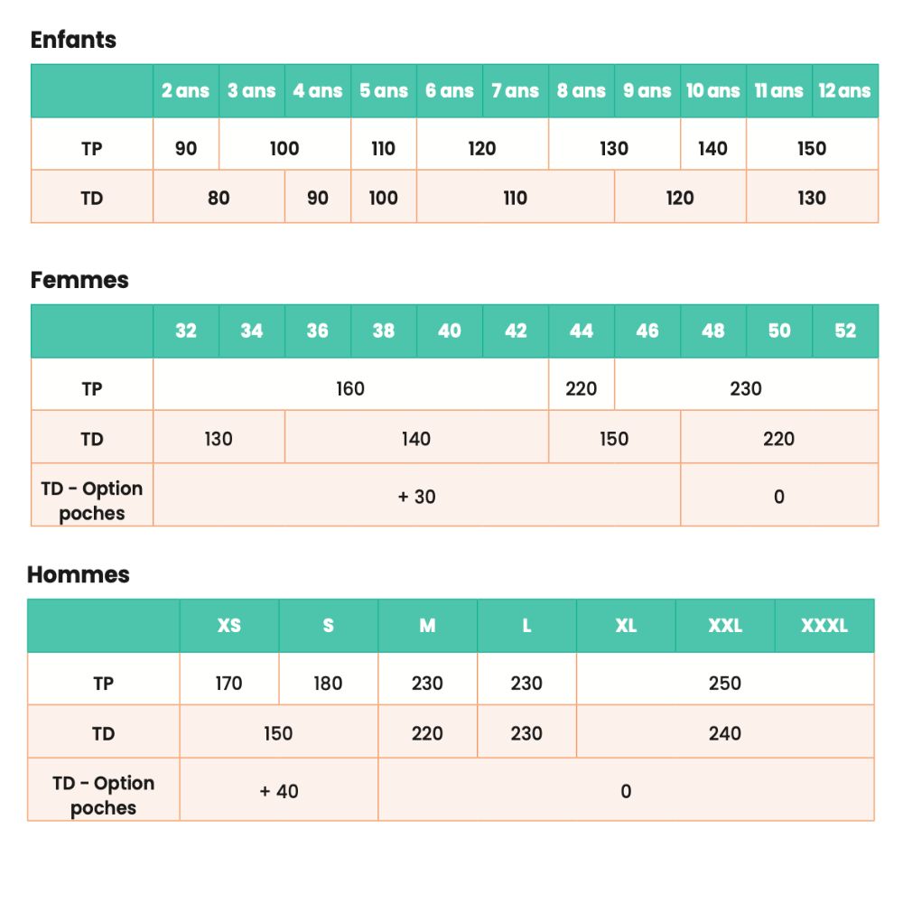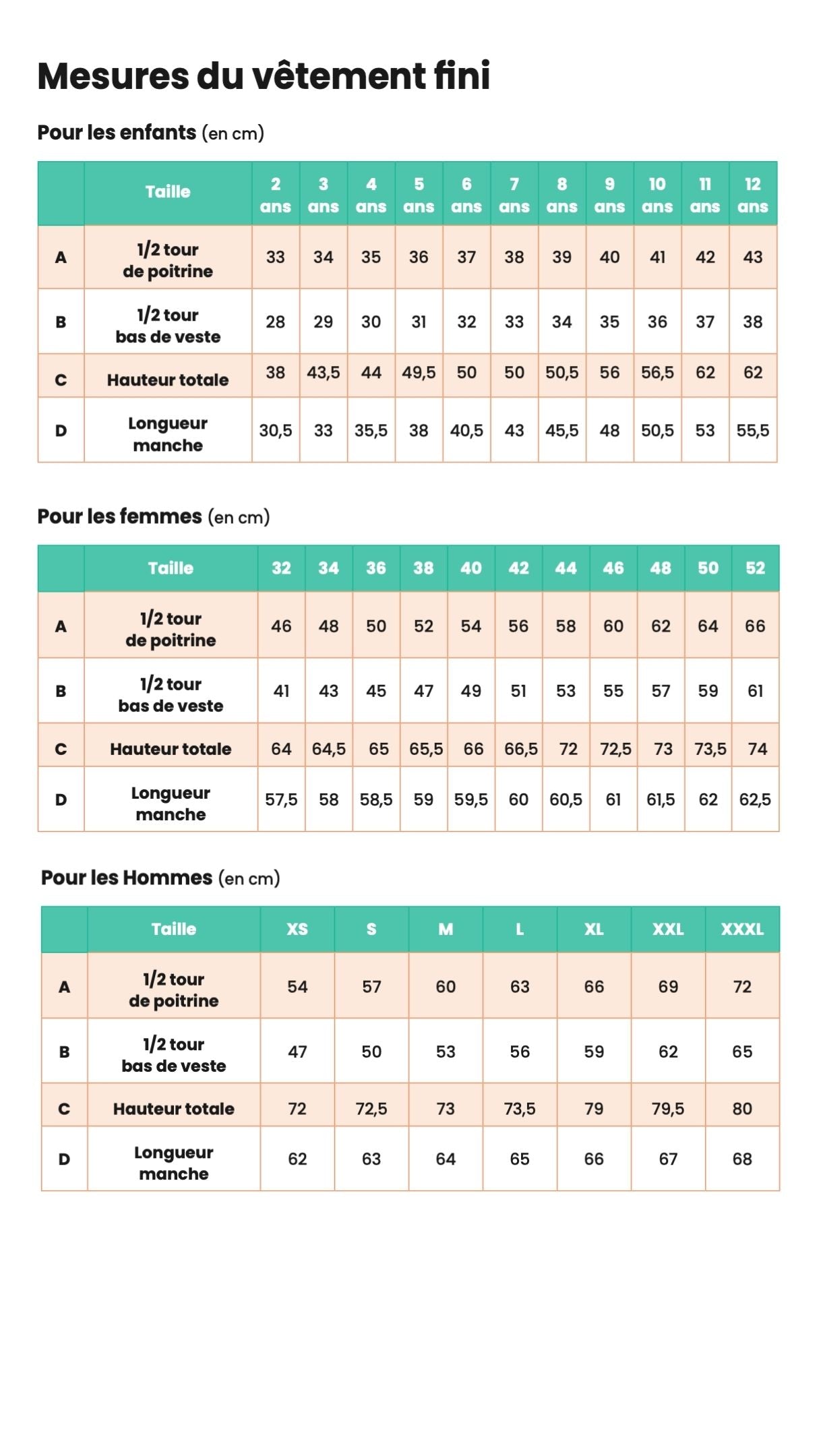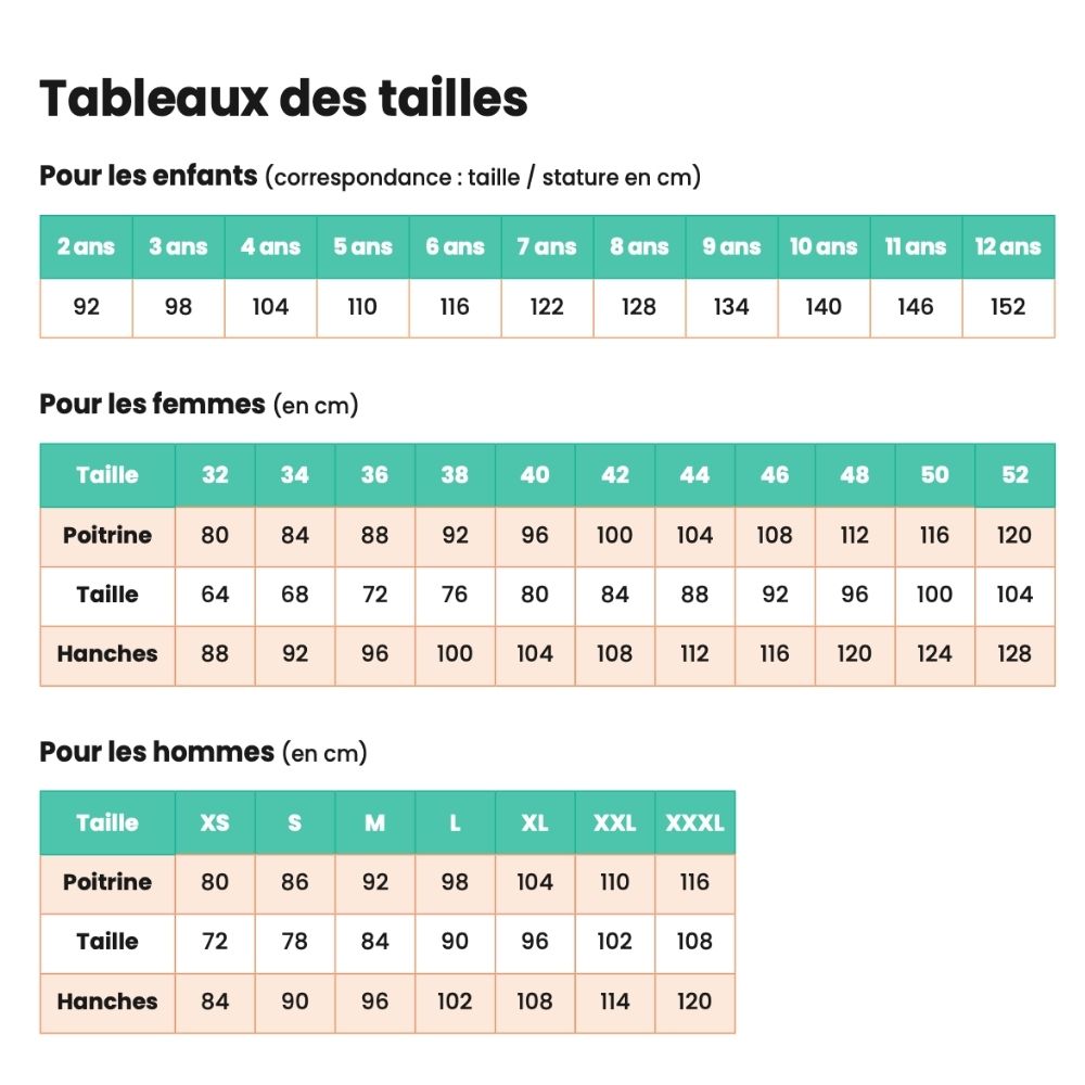 Le patron est disponible pour enfant (2 - 12 ans), femme (32 - 52) et homme (XS - XXXL)