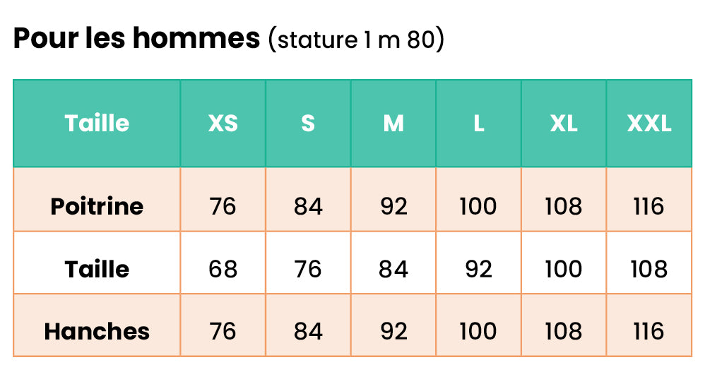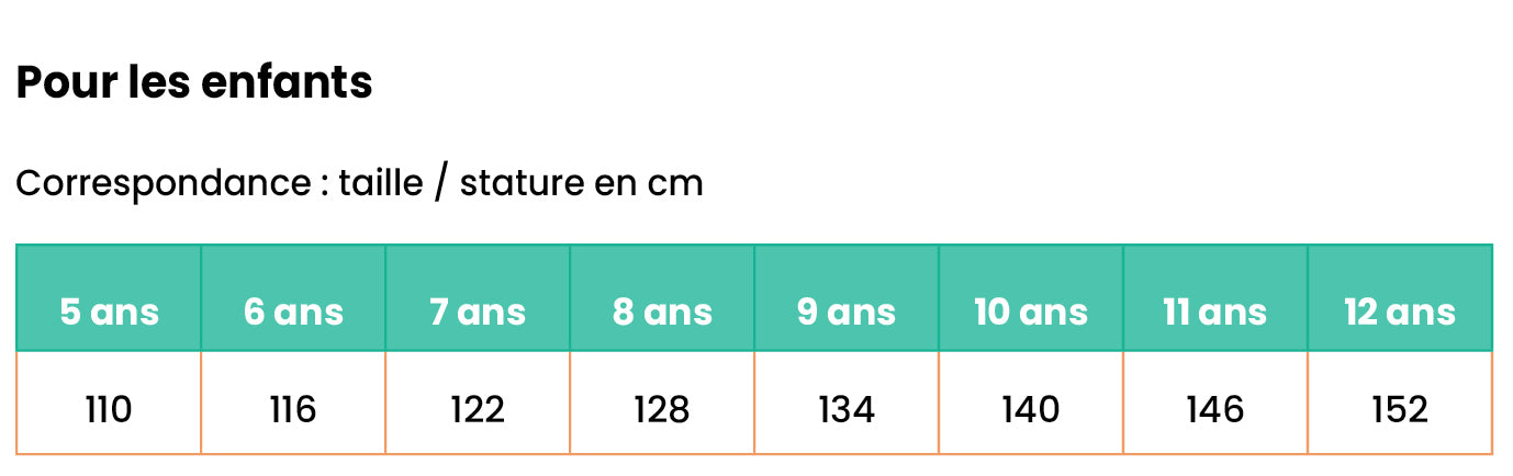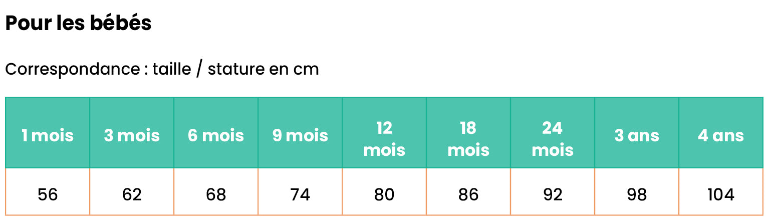 🍊 4 gammes de tailles : bébé 1 mois - 4 ans / enfant 5-12 ans / femme 32-52 / homme XS-XXL