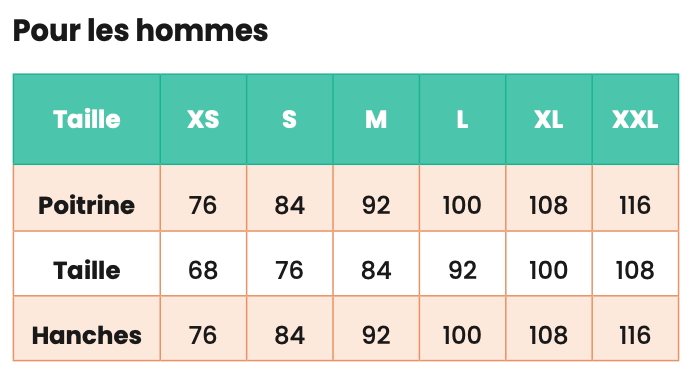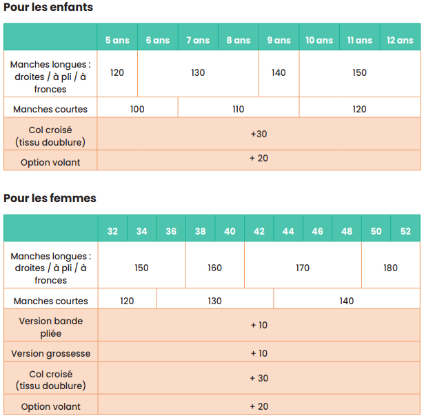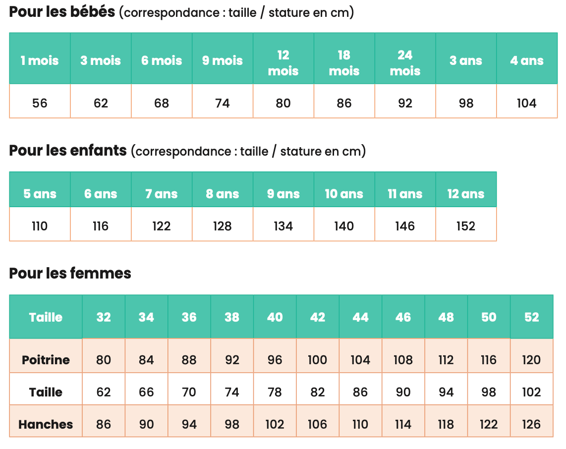 👉 4 gammes de tailles : 0-4 ans, 5-12 ans, femme 32-52 (dont une option grossesse), homme XS-XXL