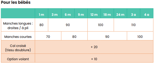 Le patron est disponible pour bébé (1 mois - 4 ans), enfant (5 - 12 ans), femme (32 - 52), homme (XS - XXL).