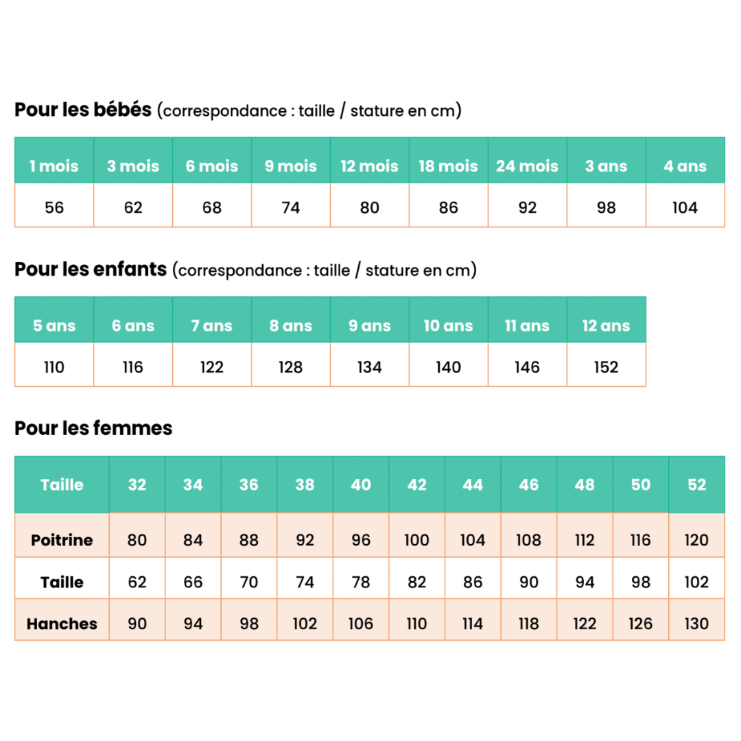 Le patron est disponible pour bébé (1 mois - 4 ans), enfant (5 - 12 ans) et femme (32 - 52).